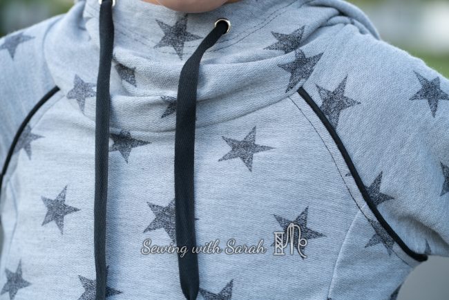 I used a star print reverse french terry from Sly Fox Fabrics for the main body and sleeves of the hoodie, and since it has a very nice smooth grey on the reverse, I used it for contrast inside the hood as well.